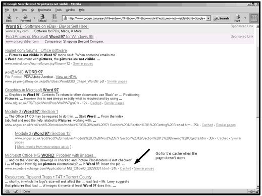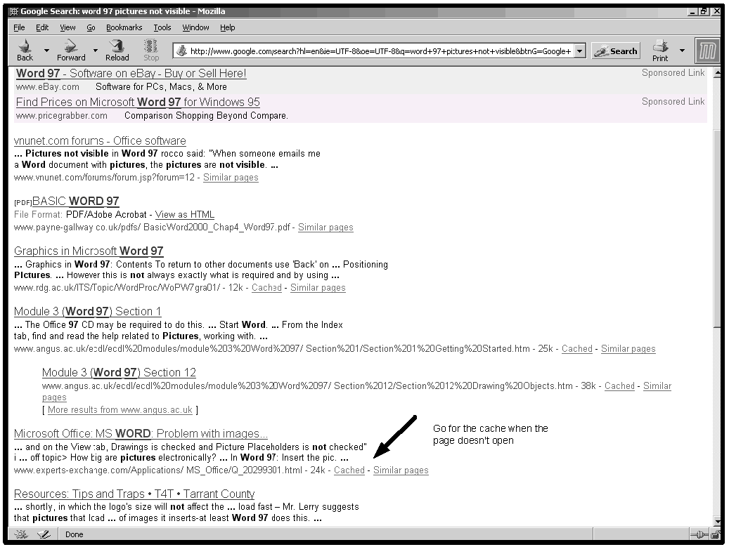 Schroedinger's Google By Jeff Pasternack 01/15/03 I thought it might be fun to replicate this trick in the name of animal cruelty…I mean…err…science. There’s a cat in my neighborhood, a rather big, black one. It’s the type of cat that chases big dogs up trees and can single-paw-edly keep the mailman from delivering to our group of houses for days on end. I figured that if I could get the cat in the box (this would please the mailman, dogs and neighbors), finding a spare vial of prussic acid and an atom (the world’s full of them, you know) would be a cinch. During the course of performing this experiment, I learned some new things. Did you know that cats that live outside tend to not be declawed? Did you know that duct tape is not a sufficiently strong enough material for holding a cardboard box closed when an un-declawed cat is inside the box? I didn’t either. But both my physician and I do now. I am in agreement with the British author Terry Pratchett, who, in his book Lords and Ladies, reached the following conclusion. He feels, and I agree, that there should be an amendment to the paradox known as Schroedinger’s Cat. There is a third state of existence aside from alive and dead when it comes to cats being contained in boxes: it is known as Bloody Furious. There is a relationship between the new and improved Schroedinger’s Cat Paradox and using Google to find answers for problems, computer or otherwise. For example, my friend Stefanie uses Word 97. One day she noticed that it stopped displaying pictures inside the document and instead showed the placeholder frame for where a picture ought to be, but wasn’t. The Help files were worthless (surprised?) and thus, the TechnoPeasant sprang into action. I searched Google on “Word 97 pictures not visible.” Here are the results: